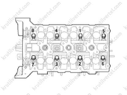 - Встановивши поршень першого циліндра у положення верхньої мертвої точки (ВМТ), перевірити зазори тільки у вказаних на наступному малюнку клапанах.