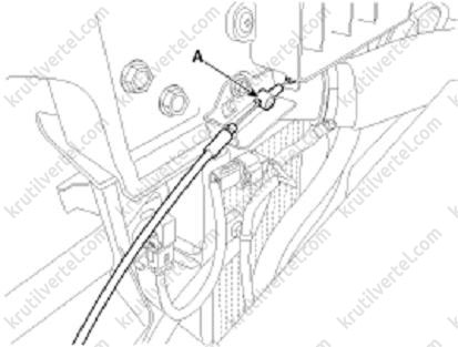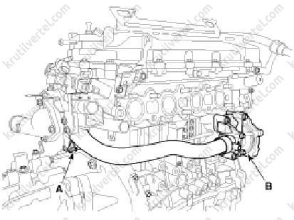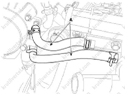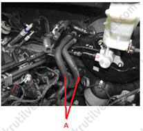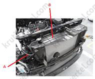 5. Від'єднати верхній (А) та нижній (В) шланги радіатора.
