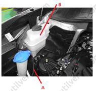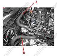 9. Від'єднати шланг розширювального бачка (А) та зняти верхній повітряний обтічник (В).