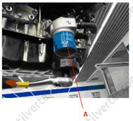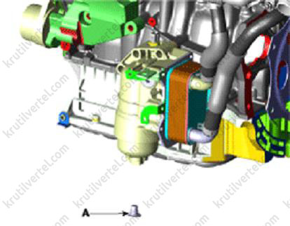 - Видалити болт із зливного отвору (А) знизу кришки масляного фільтра та злити масло з масляного фільтра.
