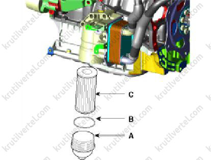 - Замінити фільтруючий елемент (С) та кільце ущільнювача (В). Наживити кришку масляного фільтра до контакту кільця ущільнювача з посадковою поверхнею, після чого затягнути кришку масляного фільтра моментом 31.5 ~ 38.5 Н·м.