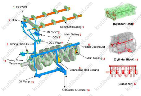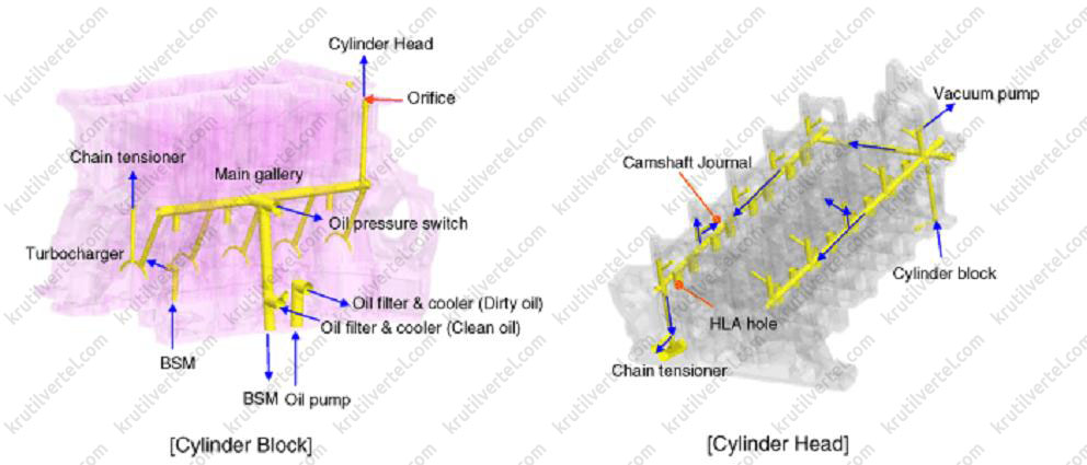 Схема потоків моторного масла в бензинових двигунах (на прикладі чотирициліндрових двигунів)