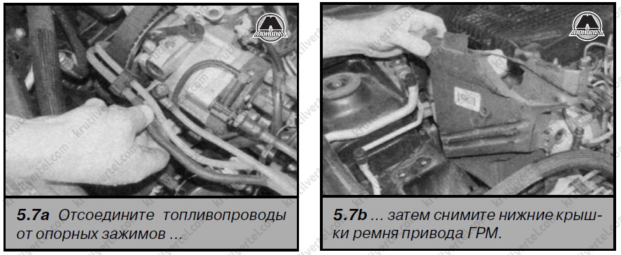 7. Від'єднайте паливопроводи від нижніх кришок ременя приводу ГРМ, знявши фіксацію затискачів та відвернувши пластиковий болт (дивіться ілюстрації). Майте на увазі, що болт встановлюється за допомогою запресування. При необхідності злегка підніміть двигун, щоб полегшити зняття кришки ременя приводу ГРМ.