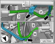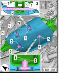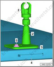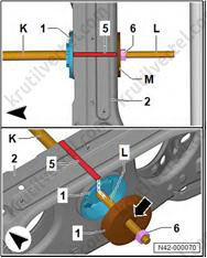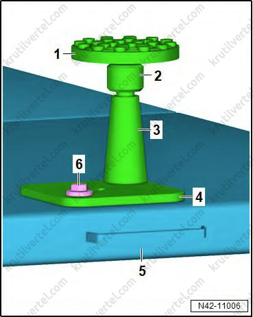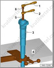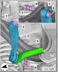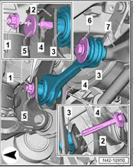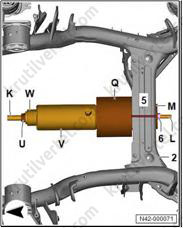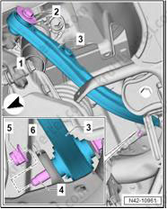 - Використовуючи домкрат для двигунів та агрегатів трансмісії (VAS 6931), обережно підніміть нижній важіль підвіски (5) вгору.