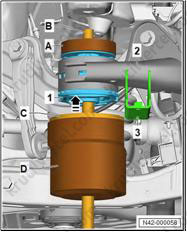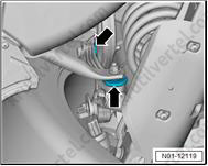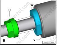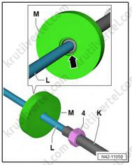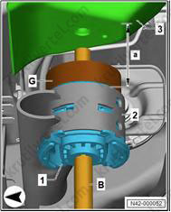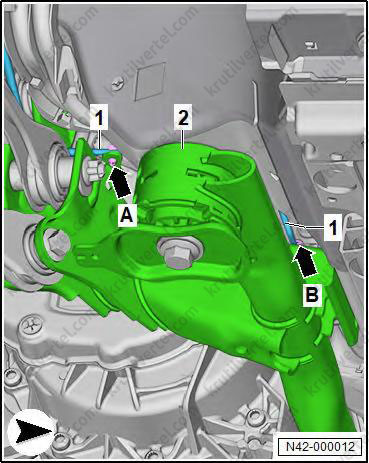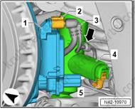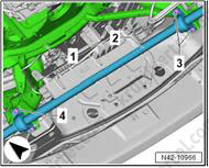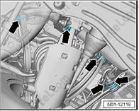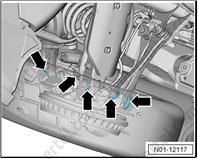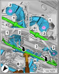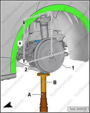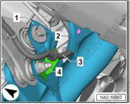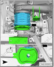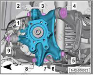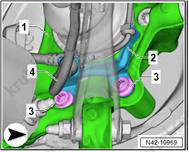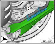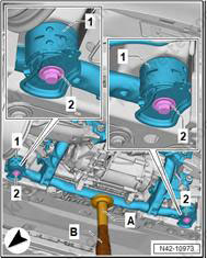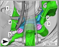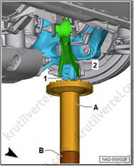 17. Утримуючи корпус ступичного підшипника (1), опустіть домкрат для двигунів та агрегатів трансмісії (VAS 6931).