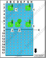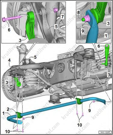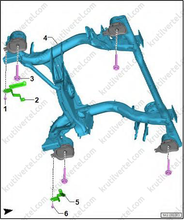 10. Позначте положення ексцентрикового болта (11) щодо підрамника (4).