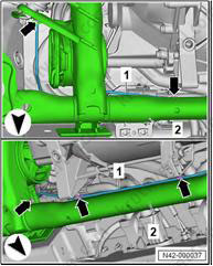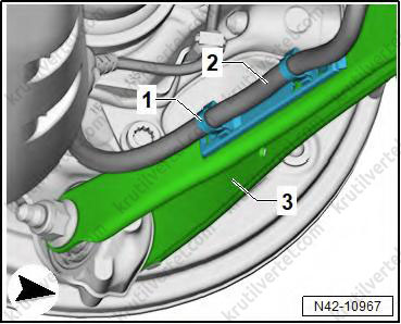 9. Вийміть болт кріплення (2) з поперечного важеля підвіски (1).