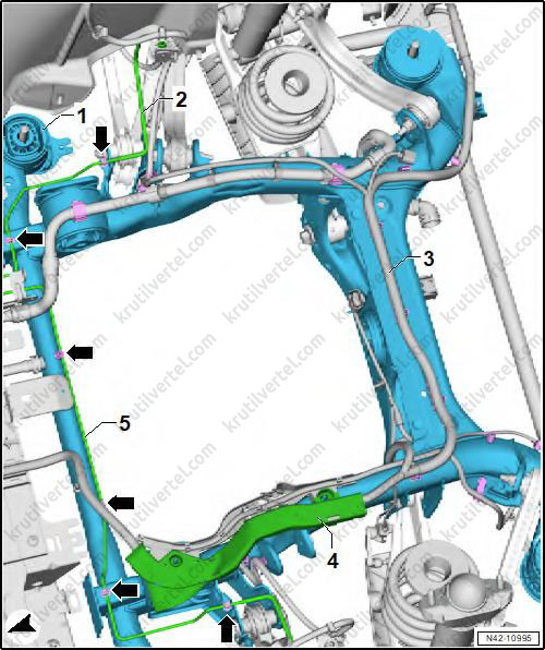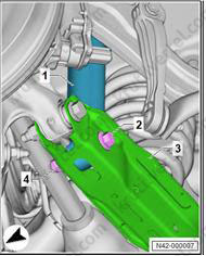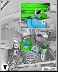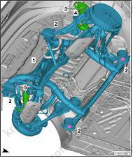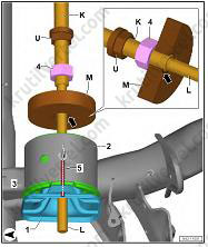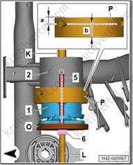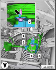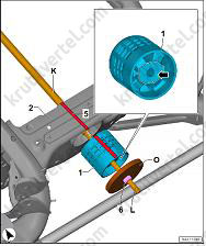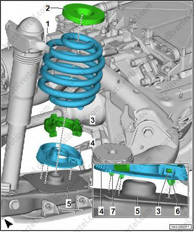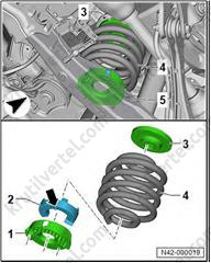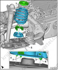 - Вставте пружину (1) з нижнім сідлом (4) та кронштейном (3) між нижнім важелем підвіски (5) та кузовом.