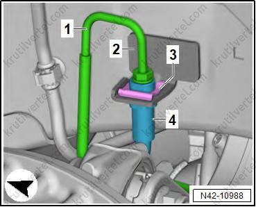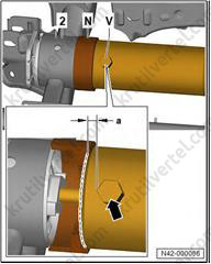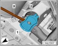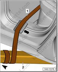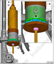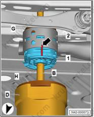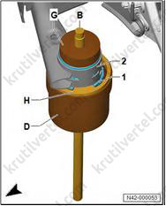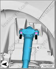 9. Зніміть захисну трубку (1) з опори амортизатора (2).