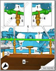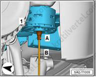 11. Розташуйте опору коробки передач (T10337) (A) під нижнім важелем підвіски (1).