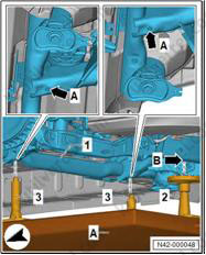 6. Розташуйте опору коробки передач (T10337) (A) під нижнім важелем підвіски (1).