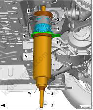 5. Встановіть інструменти з комплекту амортизатора (T10001), як показано на ілюстрації, та послабте різьбове кріплення амортизатора.