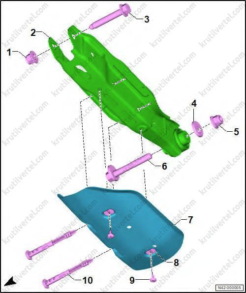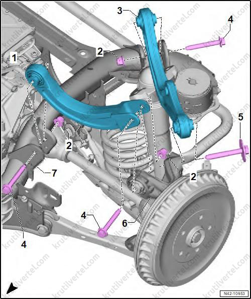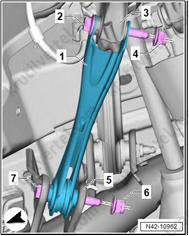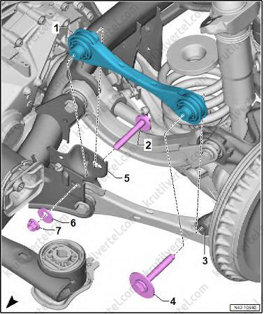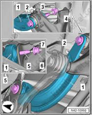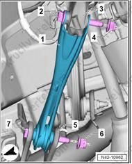 15. Вийміть болт кріплення (7) з нижнього важеля підвіски (1). Для цього за допомогою домкрата для двигунів та агрегатів трансмісії (VAS 6931) встановіть нижній важіль підвіски (1) у положення.