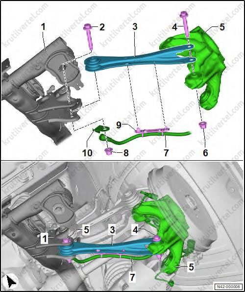 18. Опустіть нижній важіль підвіски (5) донизу та зніміть пружину (1).