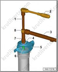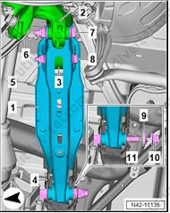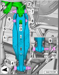 14. Витягніть болт кріплення (8) з нижнього важеля підвіски (1). Для цього за допомогою домкрата для двигунів та агрегатів трансмісії (VAS 6931) встановіть нижній важіль підвіски (1) у положення.