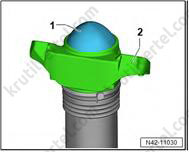 7. Встановіть кришку (1) на опору амортизатора (2) та переконайтеся, що вона надійно закріплена.