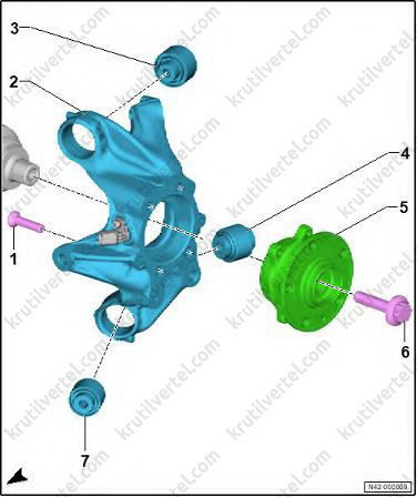 18. Утримуючи корпус ступичного підшипника (1), вийміть болт кріплення (5).