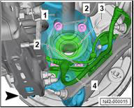 8. Відкрутіть гайку кріплення (4) поперечного важеля підвіски (1) до корпусу підшипника (3).