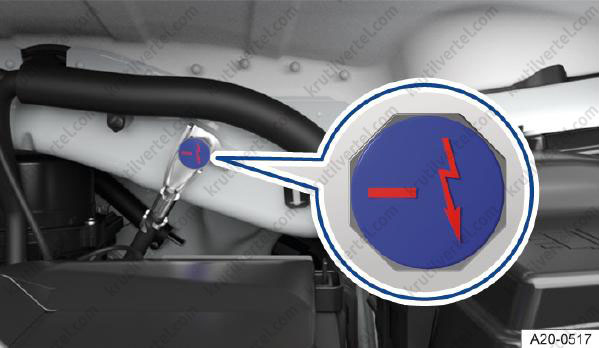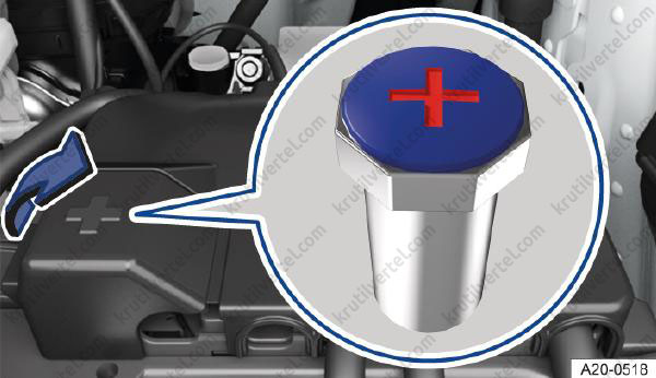 Положительный вывод для пуска от внешнего источника питания для подсоединения красного пускового кабеля расположен в подкапотном пространстве под крышкой.