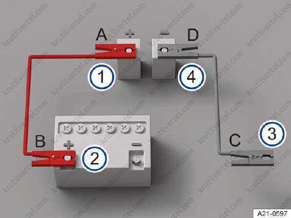 1. Неправильное обращение с пусковыми кабелями и неправильные действия при запуске от внешнего источника питания могут привести к взрыву 12-вольтной аккумуляторной батареи. Это может стать причиной тяжёлых травм: