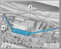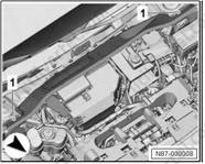 3. С помощью промышленного фена (V.A.G 1416) нагрейте боковой спойлер (1) в области склеиваемой поверхности (2).