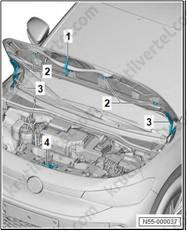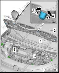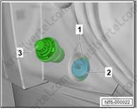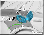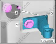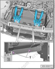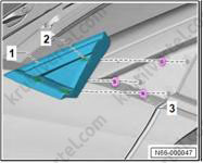 2. С помощью промышленного фена (V.A.G 1416) держатель (1) в области склеиваемой поверхности (2) и снимите его со спойлера (3).