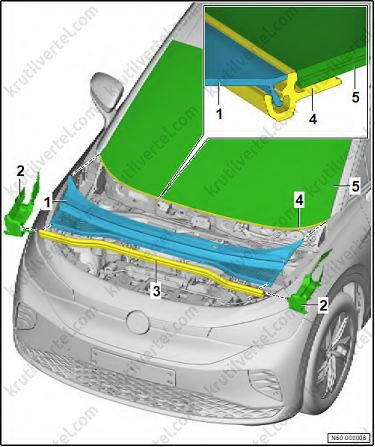 3. Установите боковой спойлер (1) с центрирующим штифтом (5) и фиксаторами (3) на дверь багажного отделения (4) и выровняйте его.