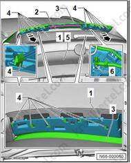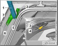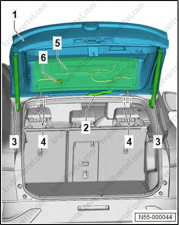 5. Установите держатель (1). Убедитесь, что фиксаторы (4) правильно вошли в зацепление с дверью багажного отделения (6).