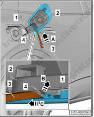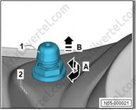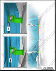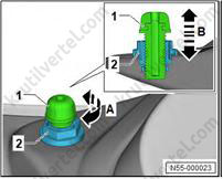 Используйте имеющийся в продаже клин, чтобы снять накладку стойки А (1) с резиновых втулок (2).