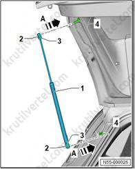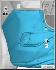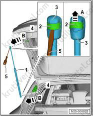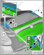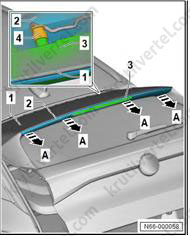 5. Снимите боковой спойлер (1) в направлении стрелки (B) с крышки двери багажного отделения (4).