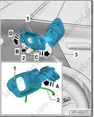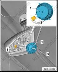 3. Поверните регулировочный узел зеркала (1) в сторону, разблокируйте и отсоедините электрический разъем (2).