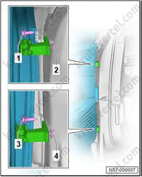 4. Прижмите боковой спойлер (1) к двери багажного отделения (4). Убедитесь, что фиксаторы (3) правильно вошли в зацепление с дверью багажного отделения (4).