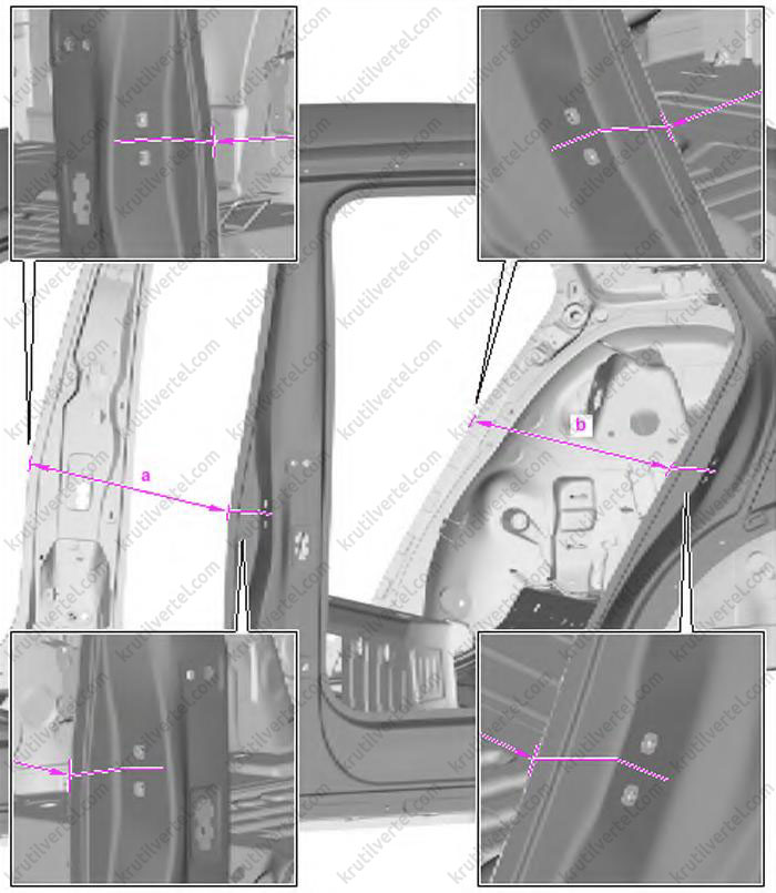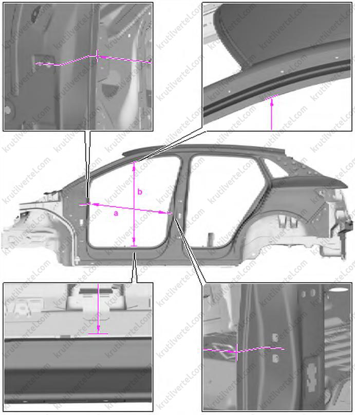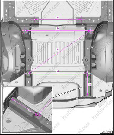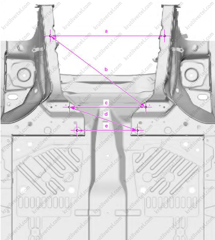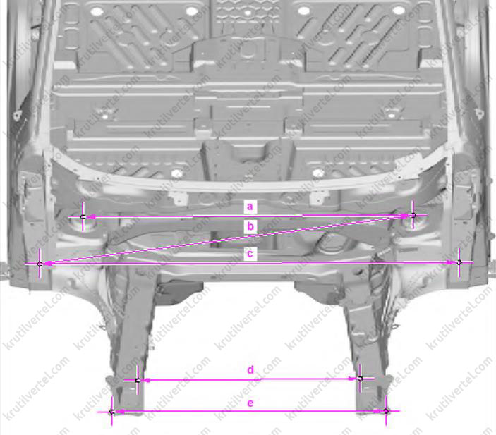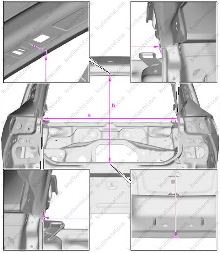 | b | 1327 мм ±2,0 мм | Диагональный размер кузова между верхним правым лонжероном и левой колесной аркой |