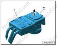 - С помощью маленькой отвертки разблокируйте фиксатор разъема (2) в направлении стрелки и отсоедините электрический разъем (1).