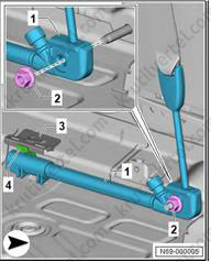 - Слегка отожмите зажим (4) по направлению вниз и отсоедините проушину переднего ремня безопасности (1) во внутрь.