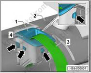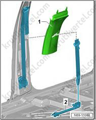 1. Сдвиньте крышку и накладку вниз в области направляющей заднего ремня безопасности (1).