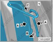 - Сожмите планки (стрелки А) и извлеките направляющую переднего ремня безопасности (1) в направлении стрелки (С).