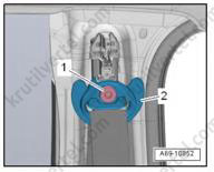 - Выведите проушину переднего ремня безопасности (2) через отверстие в верхней облицовке стойки B (1).