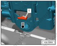- Нажмите на направляющую переднего ремня безопасности (1) в направлении стрелки (А). Одновременно вытяните направляющую переднего ремня безопасности (1) в направлении стрелки (B).