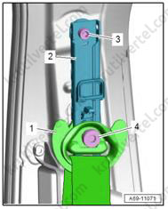 4. Отверните болт крепления (3) и извлеките механизм регулировки высоты ремня безопасности (2) из креплений на стойке В.