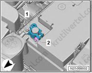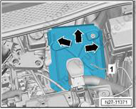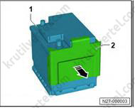 14. Вытяните аккумуляторную батарею (1) из ее полки в направлении движения автомобиля и извлеките вверх из моторного отсека.