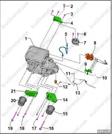 - Болт крепления опоры коробки передач (заменять новым после каждого снятия), момент затяжки 70 Н·м + довернуть на 90°.