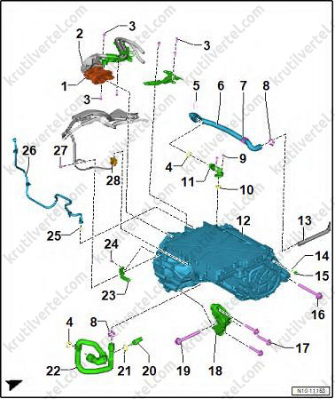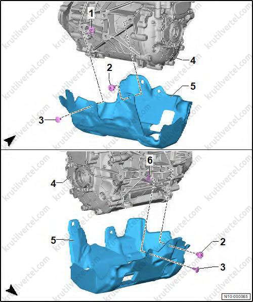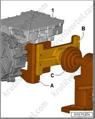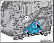 - Болт крепления кронштейна опоры коробки передач, 3 шт. (заменять новым после каждого снятия), момент затяжки 70 Н·м + довернуть на 90°.