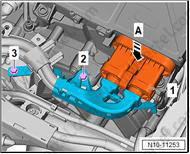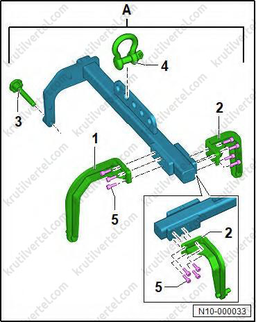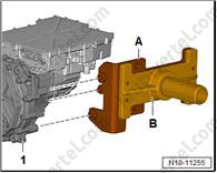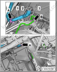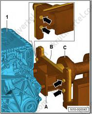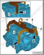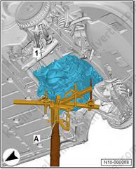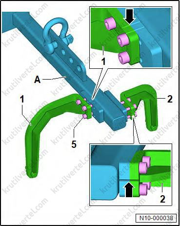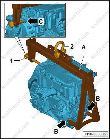 3. Вставьте кронштейн подъемного приспособления (VAS 501 021) (A) в отверстия (стрелки B).