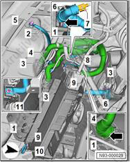 9. Ослабьте хомуты крепления (3) и отсоедините шланги охлаждающей жидкости (4) с зарядного устройства (1), а шланг охлаждающей жидкости (6) от заднего электродвигателя.