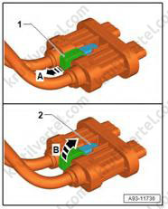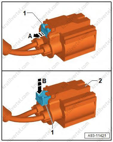 3. Нажмите на фиксирующий элемент разъема в направлении стрелки (B) и одновременно отсоедините высоковольтный разъем (2).