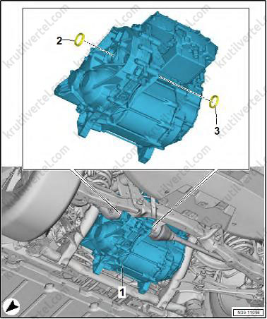 - Пробка отверстия для заправки и проверки трансмиссионного масла (заменять новой после каждого снятия), момент затяжки 45 Н·м.